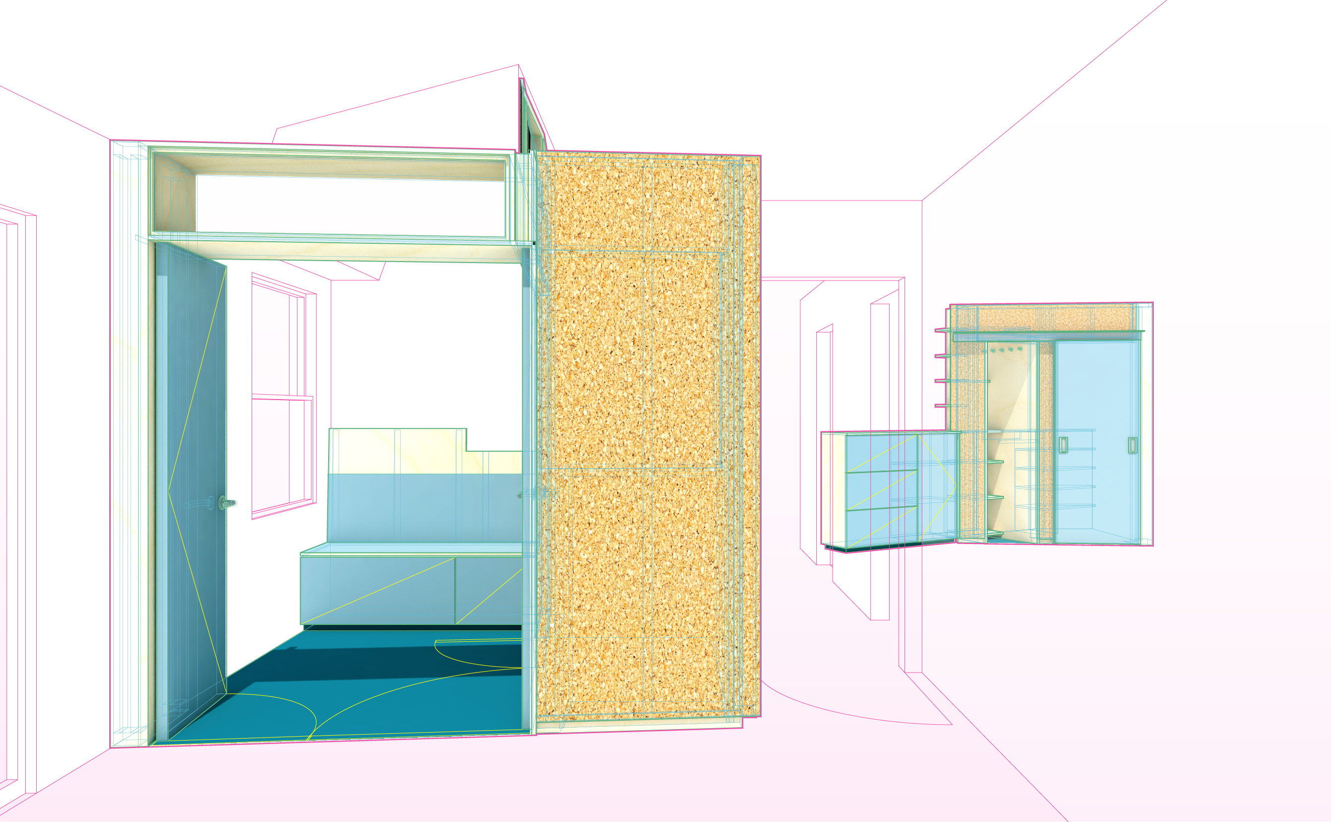 The resulting three walls enclose two spaces: the first, an ensuite bathroom which uses a set of double doors to separate the washroom from a small antechamber with a window seat and a view of the garden. The second space is a storage assembly for a second bedroom; rationalizing an angled wall into a chest of drawers, closets, and shoe racks.
